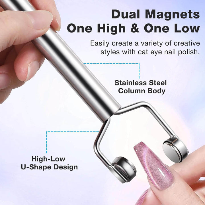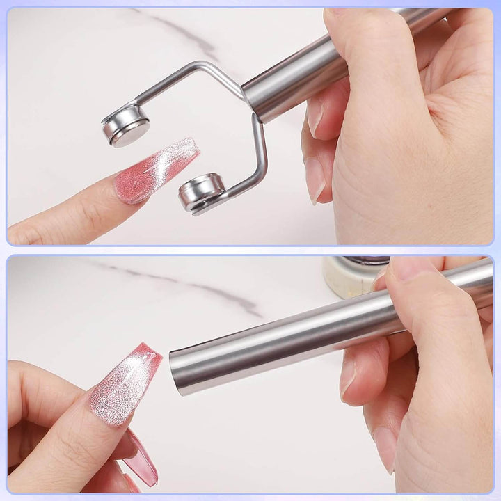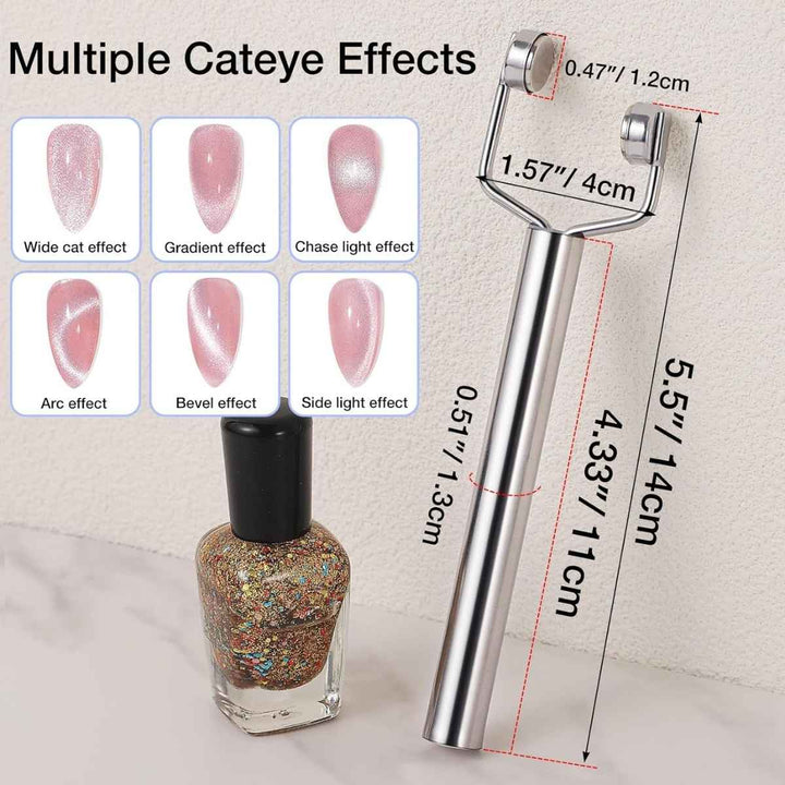 Create mesmerizing cat-eye nail effects effortlessly with the 2-in-1 Double Headed Stainless Steel Cat Eye Nail Magnet Tool. Designed for professional and home use, this high-quality magnetic wand helps you achieve stunning 3D galaxy, aurora, and shimmer effects with cat-eye gel polish. Its strong magnetism allows you to control light reflection and pattern formation easily, giving your nails a flawless salon finish every time.