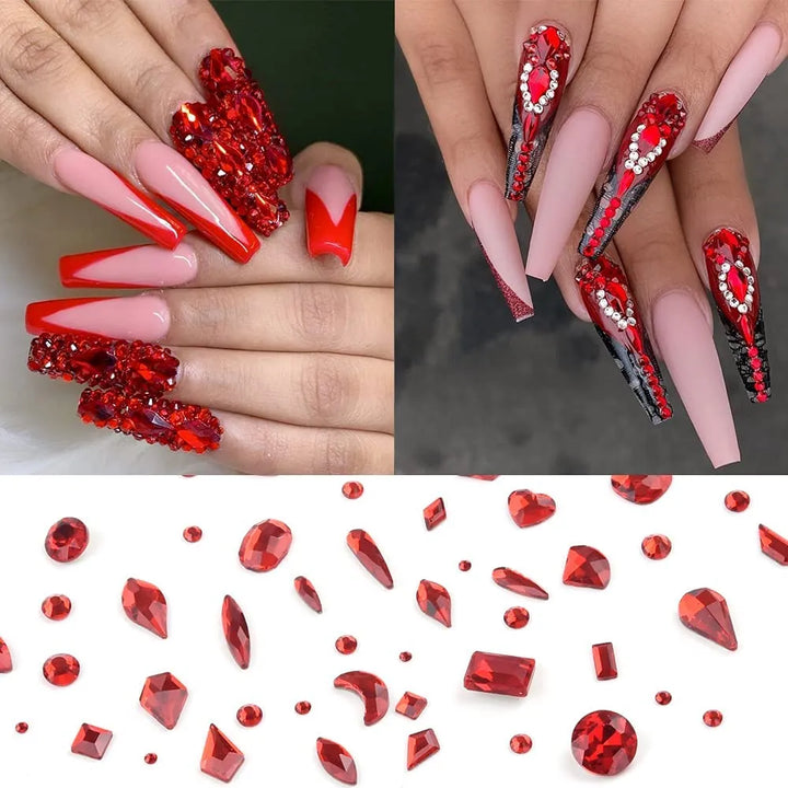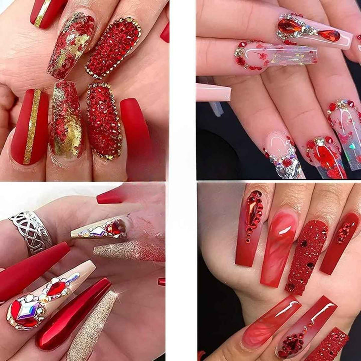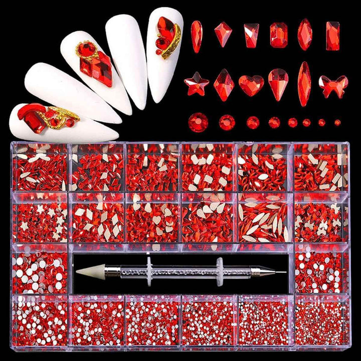 Upgrade your manicure with this 21-Grid Red Crystal Nail Rhinestones Set — designed to add a bold and dazzling shine to every nail look. Packed with a beautiful mix of red AB crystal shapes and sizes, this set makes it easy to create professional 3D nail art at home or in salon.The included picker pen tool helps you place each rhinestone quickly and accurately — no mess, no slipping. Perfect for acrylic nails, gel nails, press-ons, and special designs for parties, weddings, Valentine’s Day, and all glam occasions.Elegant organized storage keeps every shape separated and easy to use — truly a must-have accessory for every nail artist and beauty lover.