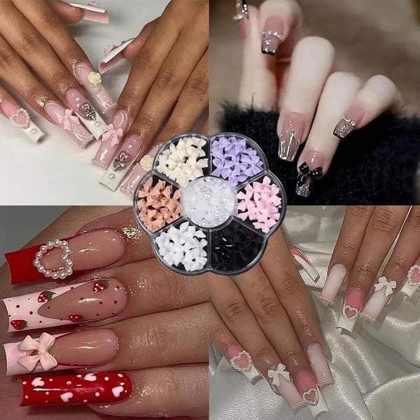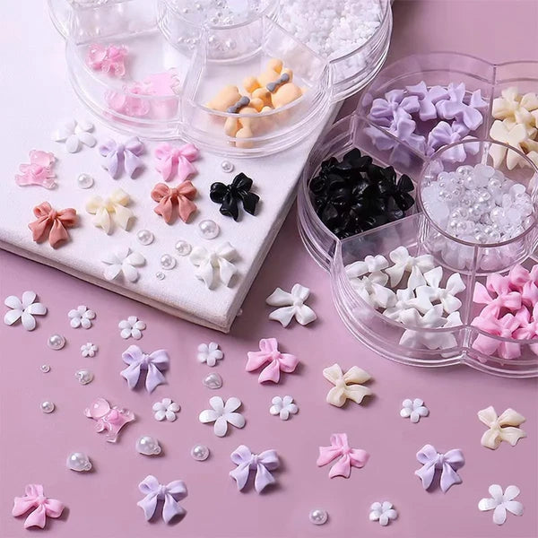 3D Nail Art Bow Charms Set With Pearl Rhinestones & Flower For Creating Eye Catching Nail Designs.