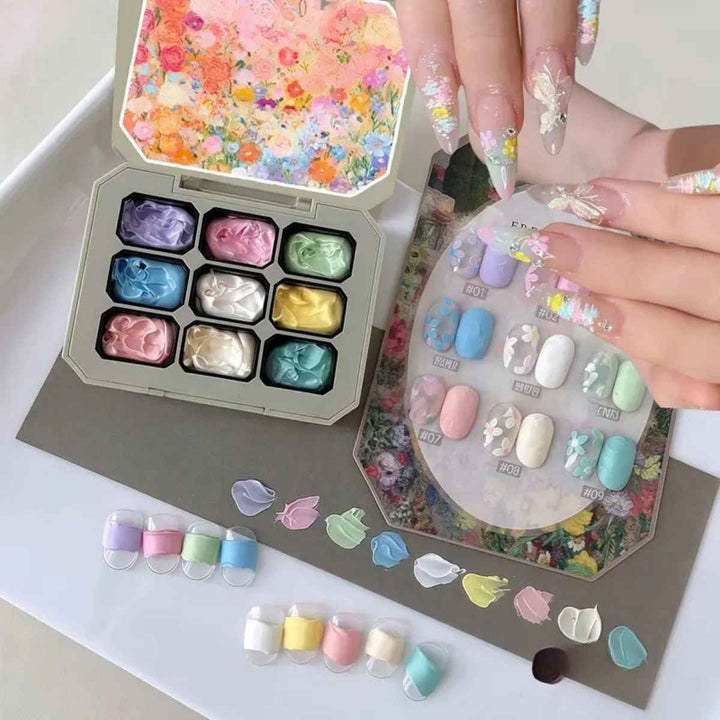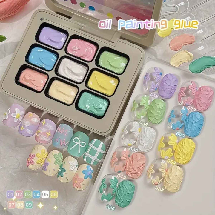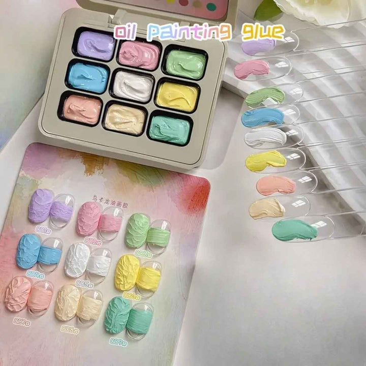 Create stunning, artistic nail designs with the 9-Color Oil Painting Gel Palette. Featuring nine creamy pastel shades, this set lets you sculpt, paint, and blend effortlessly for beautiful 3D effects. Perfect for textured floral, gradient, or artistic nail designs, it offers smooth application, strong pigmentation, and lasting shine. A must-have for professional nail artists and DIY creators who love soft, dreamy pastel aesthetics.
