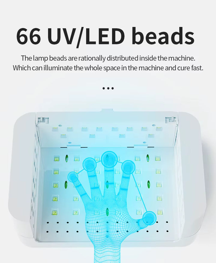 Blueque 180W Professional UV LED Nail Lamp offers super-fast gel curing with 66 powerful LEDs for even light distribution. Designed for both salon and home use, it ensures smooth, long-lasting nail results without overheating. The smart sensor and multiple timer settings make drying quick, safe, and easy for all gel types.
