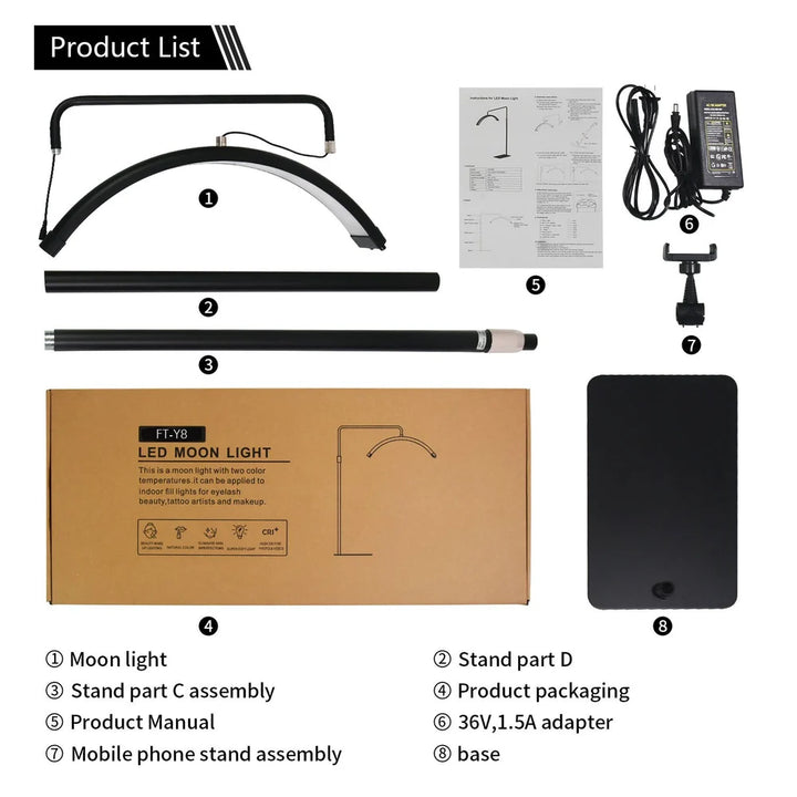 - Half-moon Floor Fill Light: Special half-moon shape design, with 238pcs high-quality lamp beads, 36W high power, and 90+ high color rendering, suitable for desktop vlog, beauty salon live streaming, beauty project, etc.