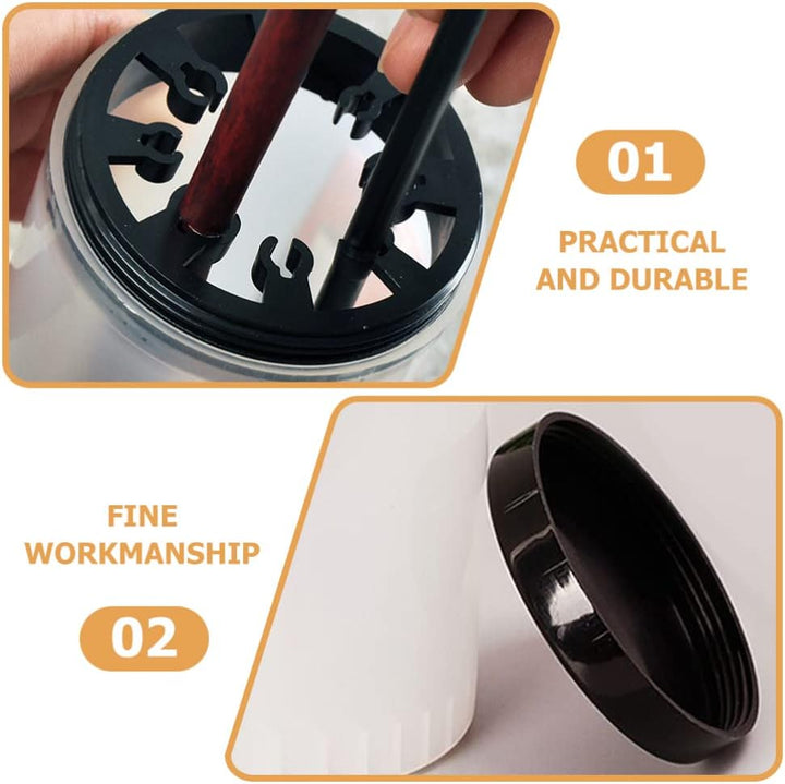 It’s designed with a smart holder lid that keeps brushes upright while drying or soaking.