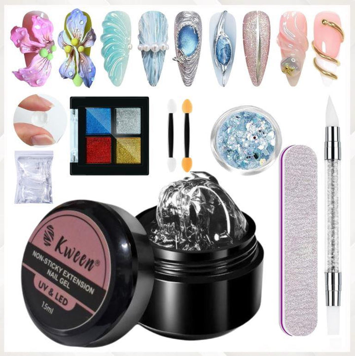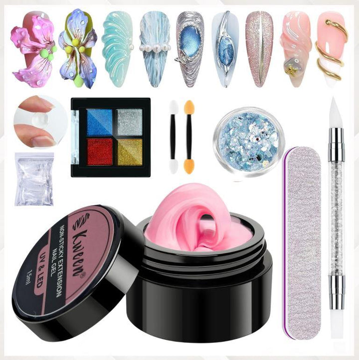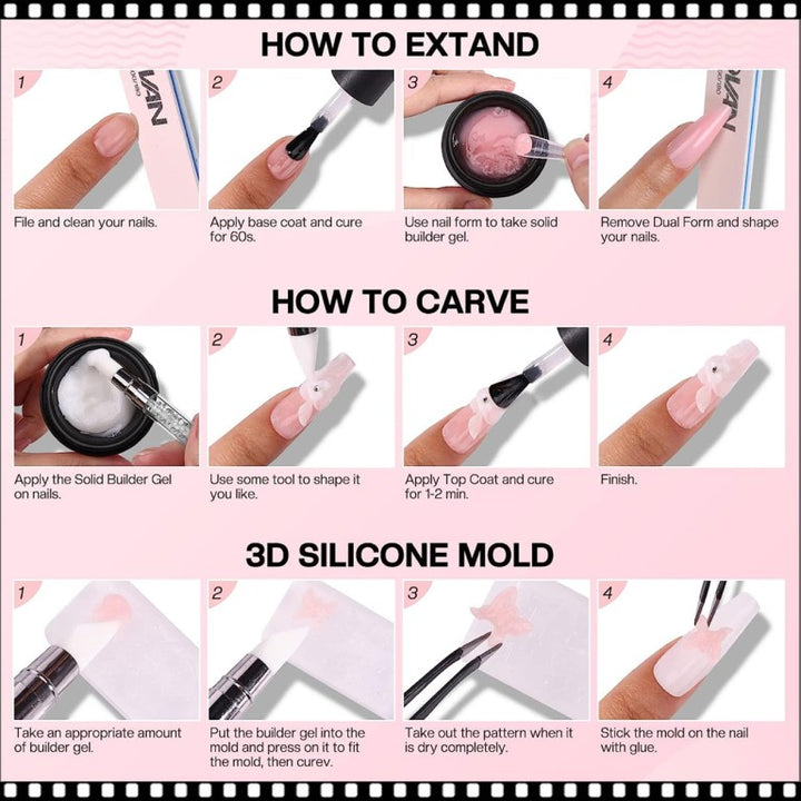 - Builder Gel Nail Kit: Contains Clearnail gel builder(non-sticky, needs curing), Double-end 3D nail carving silicone pen, Chrome palette (random), glitter/sequins, dual forms for gel builder for nails, Filler. This builder gel kit(hard gel kit) contains almost everything for both nail starters and nail artists to do nail extensions, nail sculpture, 3D nail art design, and so on.